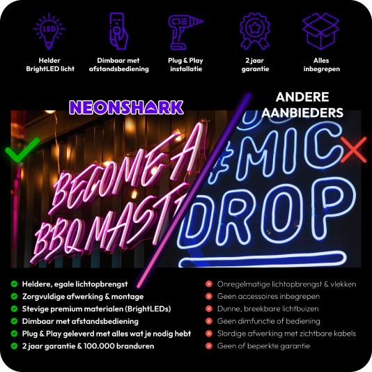 De garantie op je Neon Sign hangt af van de plaatsing. Voor indoor Neon Signs bieden we een garantie van twee jaar, omdat deze minder aan externe factoren worden blootgesteld. Outdoor Neon Signs hebben een garantie van één jaar, omdat ze onderhevig zijn aan weer en wind. Zo zorgen we ervoor dat je altijd een passende dekking hebt.
